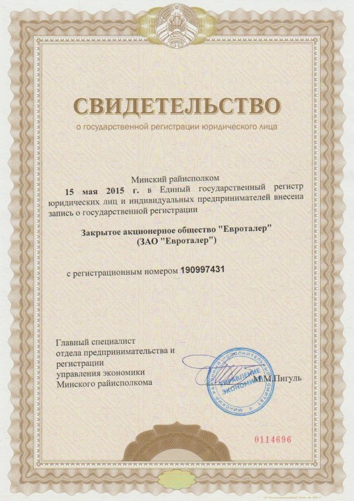 Юридическое лицо: Закрытое акционерное общество «Евроталер» Минск, Республика Беларусь